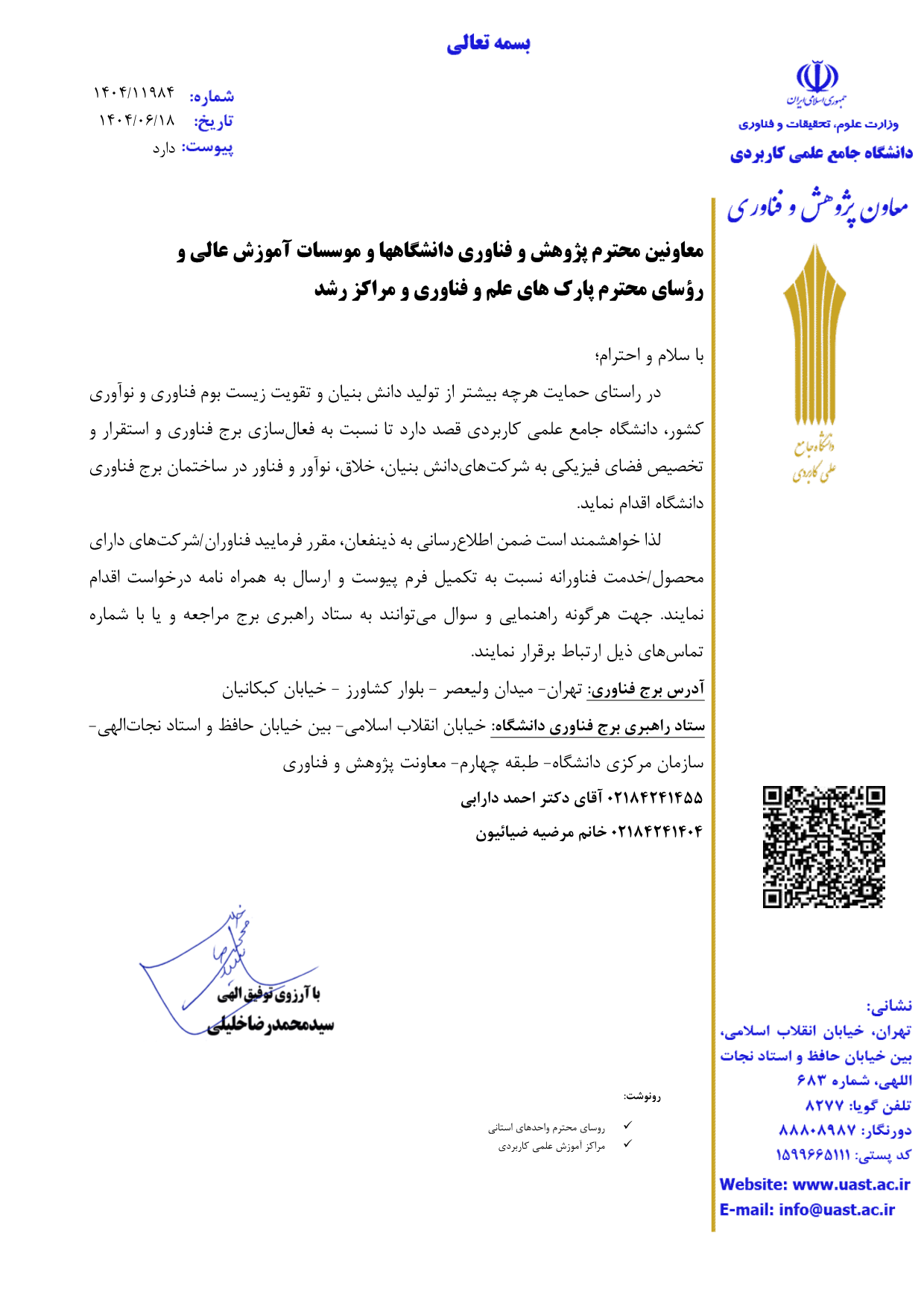 فراخوان استقرار شرکت های دانش بنیان و هسته های فناور در برج فناوری دانشگاه جامع علمی کاربردی - تاریخ : ۳۱ شهریور ۱۴۰۴ /file/download/calendar/1758518760-68d0dde8ac70b-3.png /file/download/calendar/1758518824-68d0de283489f-attachments-anesjryj.zip