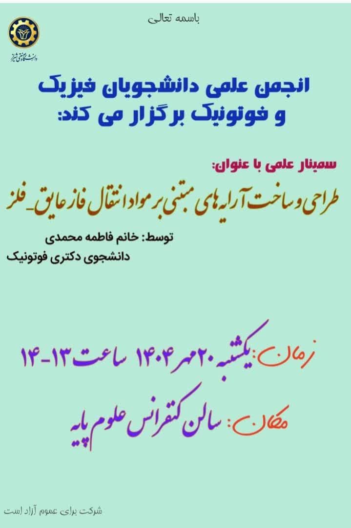 سخنرانی علمی انجمن علمی فیزیک و فوتونیک طراحی و ساخت آرایه های مبتنی بر مواد انتقال فاز عایق-فلز